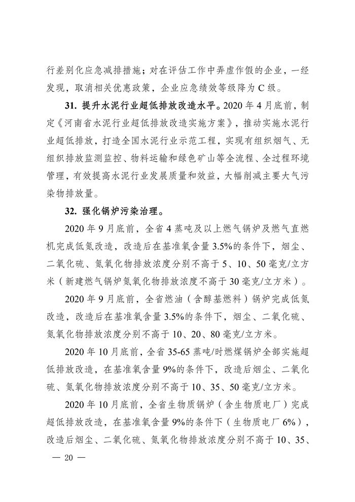 3、2020年4月底前,制定《河南省水泥行业超低排放改造实施方案》,推动实施水泥行业超低排放改造。